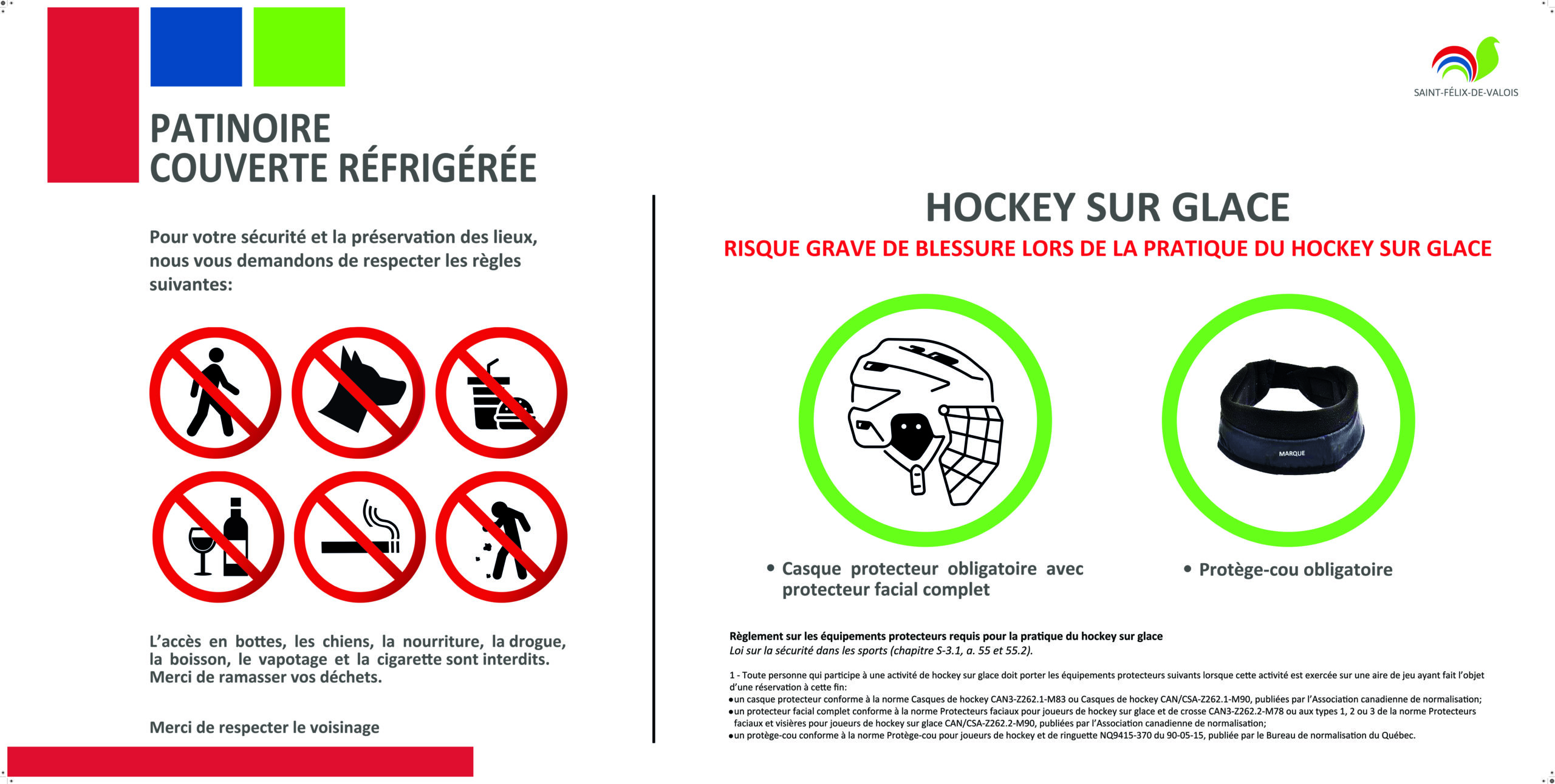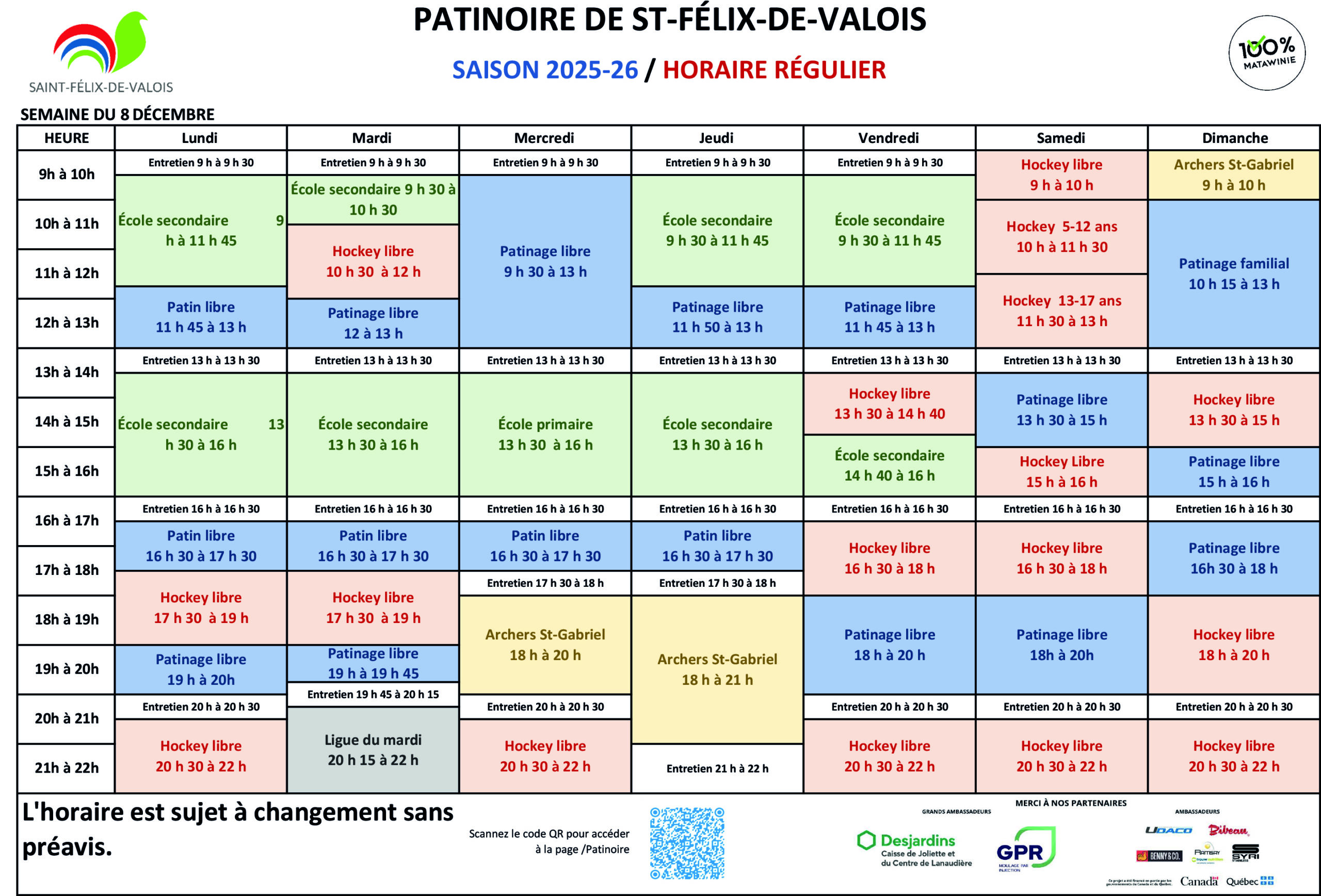 La patinoire réfrigérée ouvrira le 24 novembre 2025. La saison de patinage s’étend de décembre à avril selon les températures. L’horaire est publié sur cette page en fonction des réservations. Il est sujet à changement sans préavis. Merci de votre compréhension.