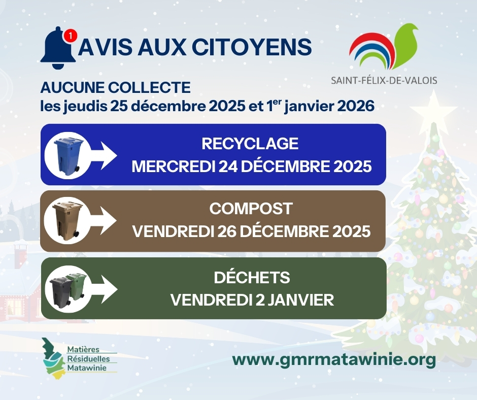 Plusieurs nouveautés dans la gestion des collectes de matières résiduelles, notamment l’ajout de collectes de résidus vert en mai et octobre, celle de sapin le 8 janvier et l’ajustement des encombrants.